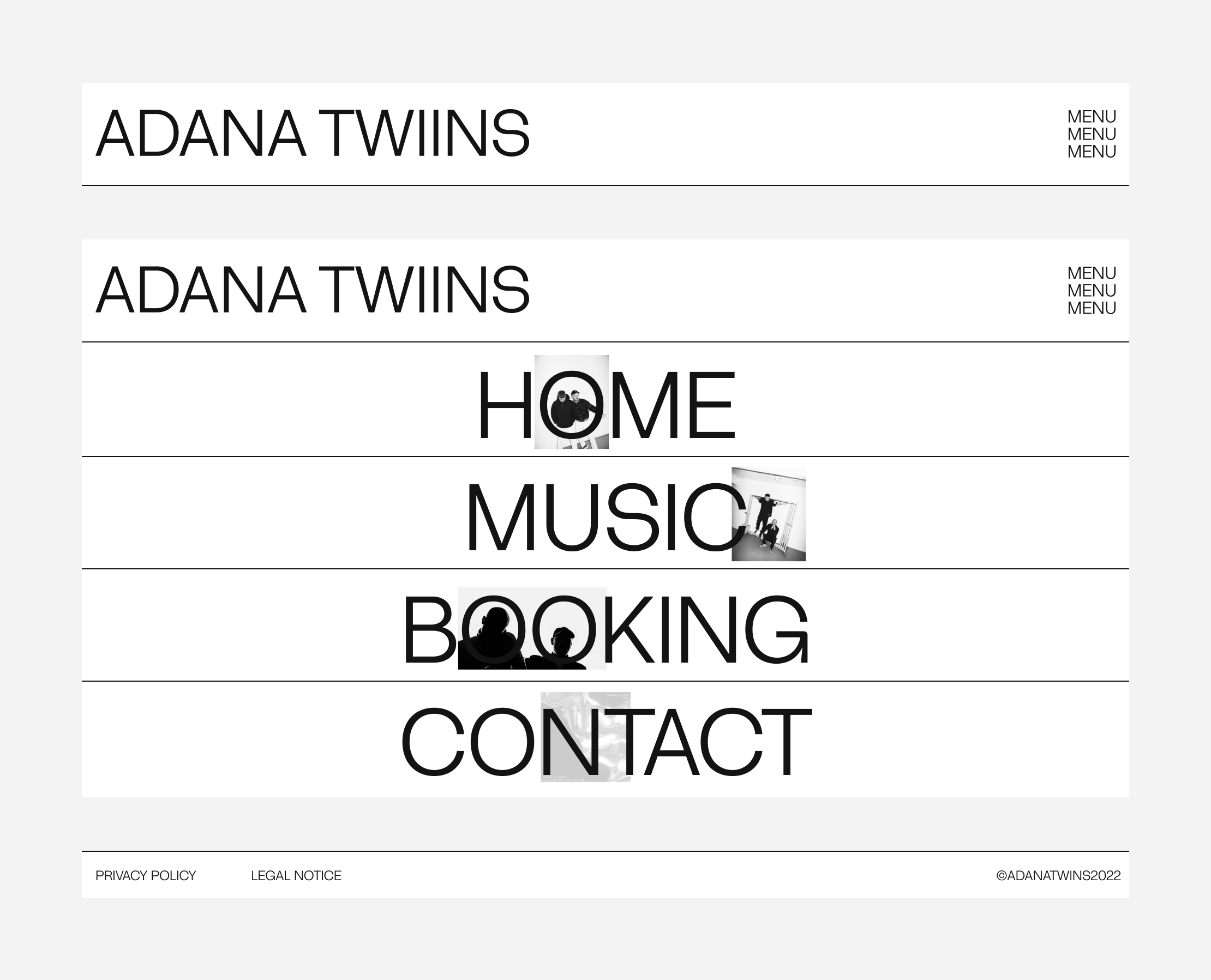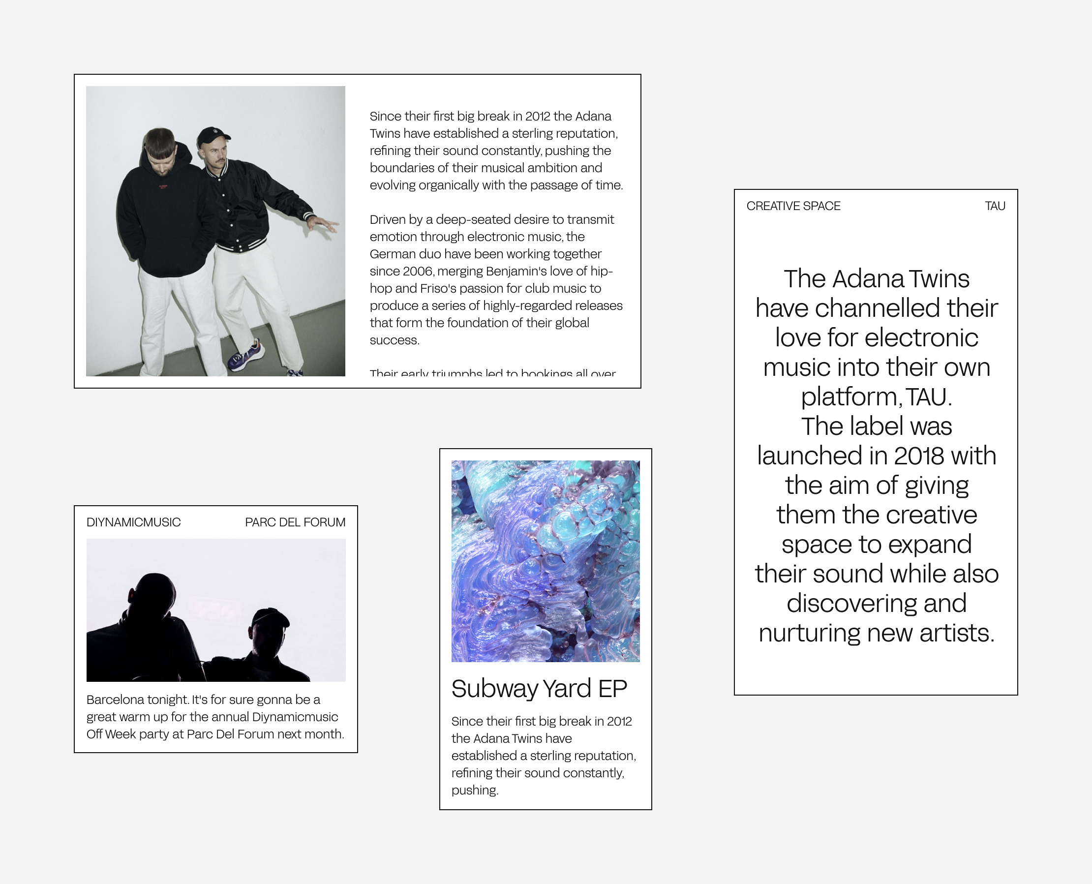 Imaginer une identité digitale pour Adana Twins fut l’occasion d’explorer une direction artistique plus radicale, à la croisée de la culture club, du design éditorial et de l’esthétique brutaliste. Duo emblématique de la scène électronique internationale basé à Hambourg, Adana Twins développe un univers sonore intense, sombre et émotionnel, nourri par une forte sensibilité visuelle.